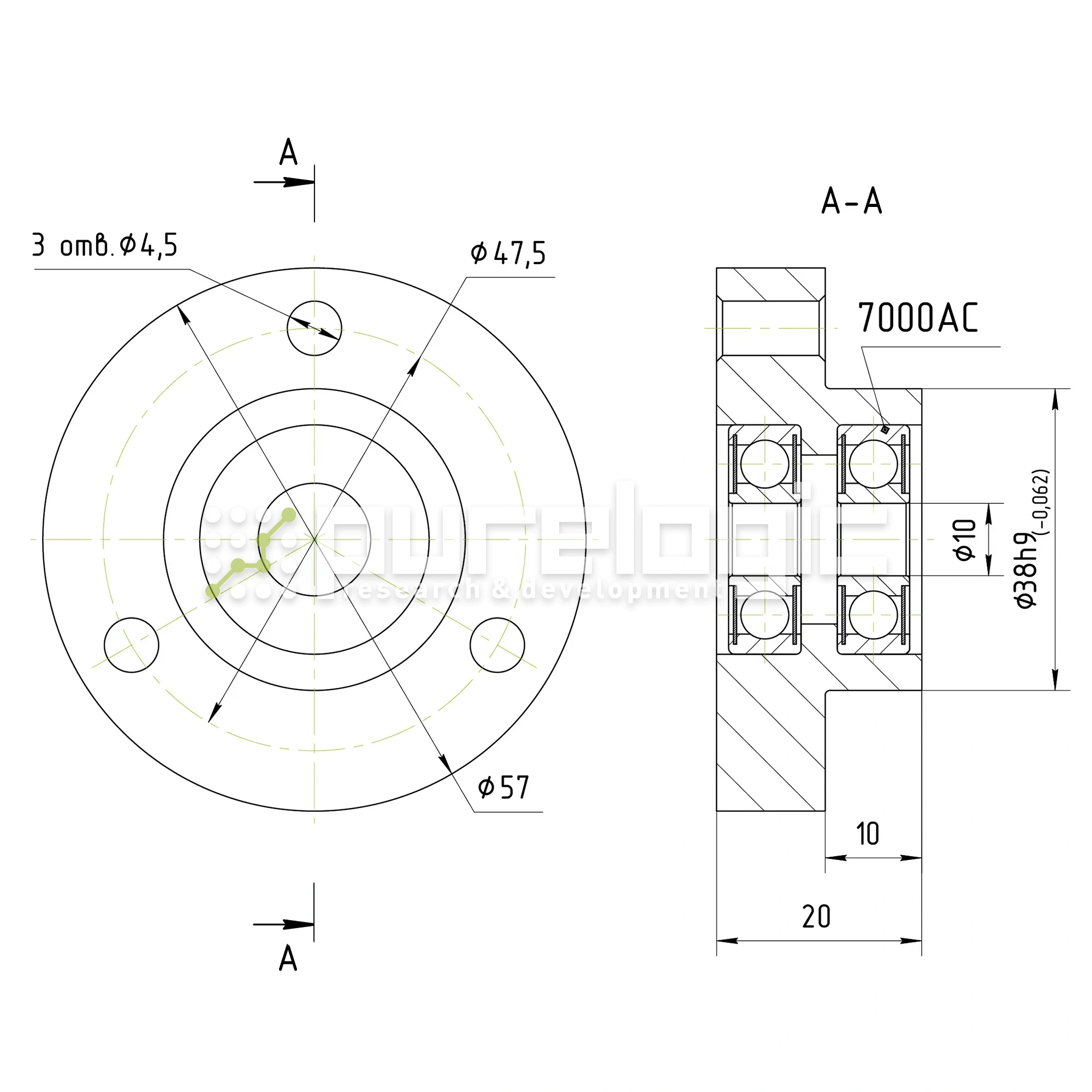 Упорный подшипниковый блок производства Purelogic R&D с радиально-упорными подшипником для ходового винта и возможностью компенсации люфта подшипников. D=10мм