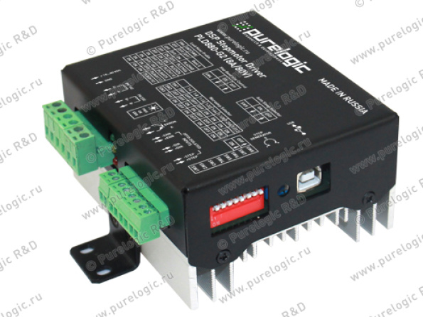 PLD880-G2 — цифровой драйвер шагового двигателя 80В/8А/300кГц на базе сигнального процессора DSP с возможностью настройки параметров драйвера при помощи ПК по изолированному USB интерфейсу. Деление шага двигателя 1:1...1:512. Использование сигнального процессора позволяет более точно контролировать токи в обмотках ШД с применением математических алгоритмов обработки, сделать настройку драйвера под конкретный ШД более гибкой. Драйвер обладает высоким КПД, небольшими габаритами, ШД вращается практически без шума, ШД не нагревается. Драйвер позволяет оптимально управлять шаговым двигателем с ЧПУ системах. Устройство имеет встроенные цепи защиты от КЗ обмоток ШД, от эффекта обратной ЭДС от ШД; встроенный компенсатор среднечастотного резонанса ШД; датчик температуры; режим удержания ротора ШД; плавный запуск ШД; защиту от переполюсовки напряжения питания и схему плавного пуска ШД; дампер; выход аварии; генератор частоты STEP и защиту от превышения входной частоты STEP. Драйвер работает со стандартным протоколом управления STEP/DIR/ENABLE . Все управляющие входы драйвера оптоизолированы и совместимы с логическими уровнями 2.5В, 3.3В, 5В. Так же модуль снабжен режимом AUTO-SLEEP, который включается при отсутствии сигнала STEP.