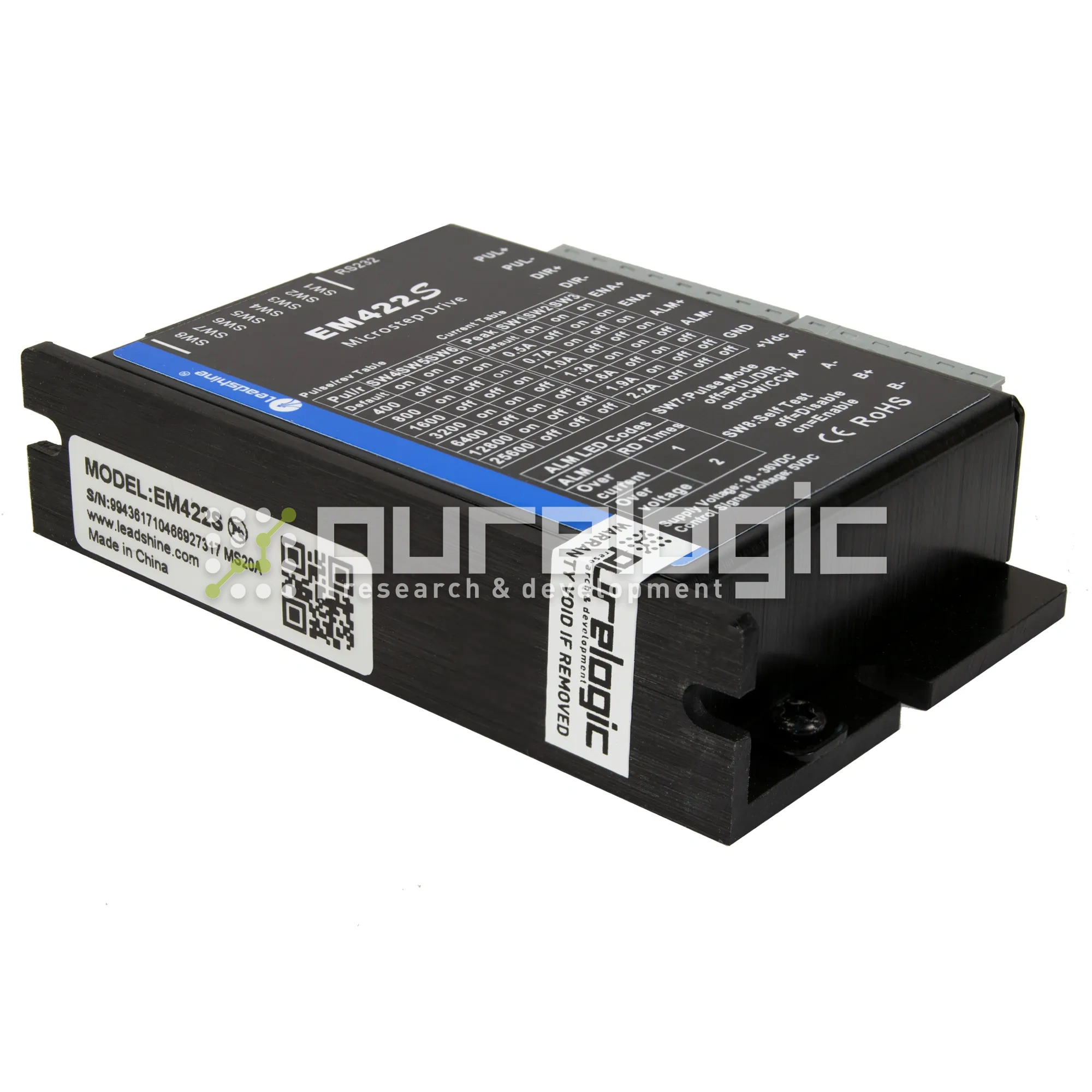 Драйвер шагового двигателя Leadshine EM422S 36В/2.2А/200кГц. Деление шага от 1:1 до 1:128. Оптоизолированные входы управления STEP, DIR, ENABLE. Выбор режима работы STEP/DIR или CW/CCW. Автонастройка под ШД. Компенсация резонанса. Защита от КЗ обмоток ШД, от обратной ЭДС ШД, режим удержания ротора ШД. Драйвер предназначен для управления ШД типа PL20, PL28, PL35, PL39 и PL42 (NEMA 8, 11, 14, 17).
