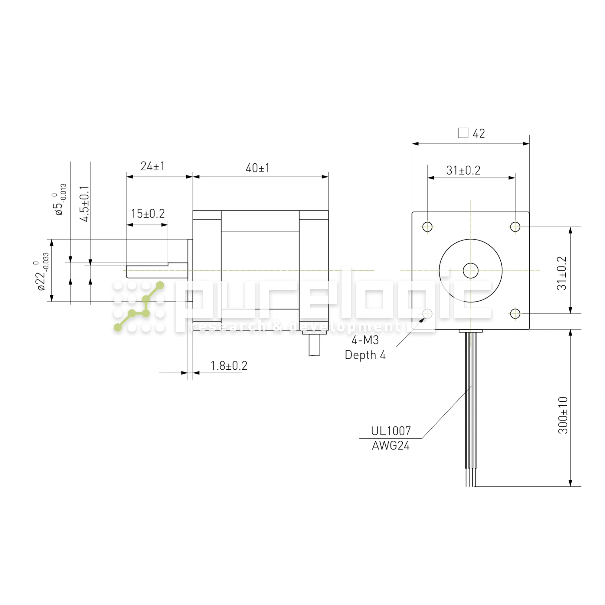 42x39мм, 4кг.см, вал 5мм, ток 1.5А, шаг 1.8°, 2 фазы