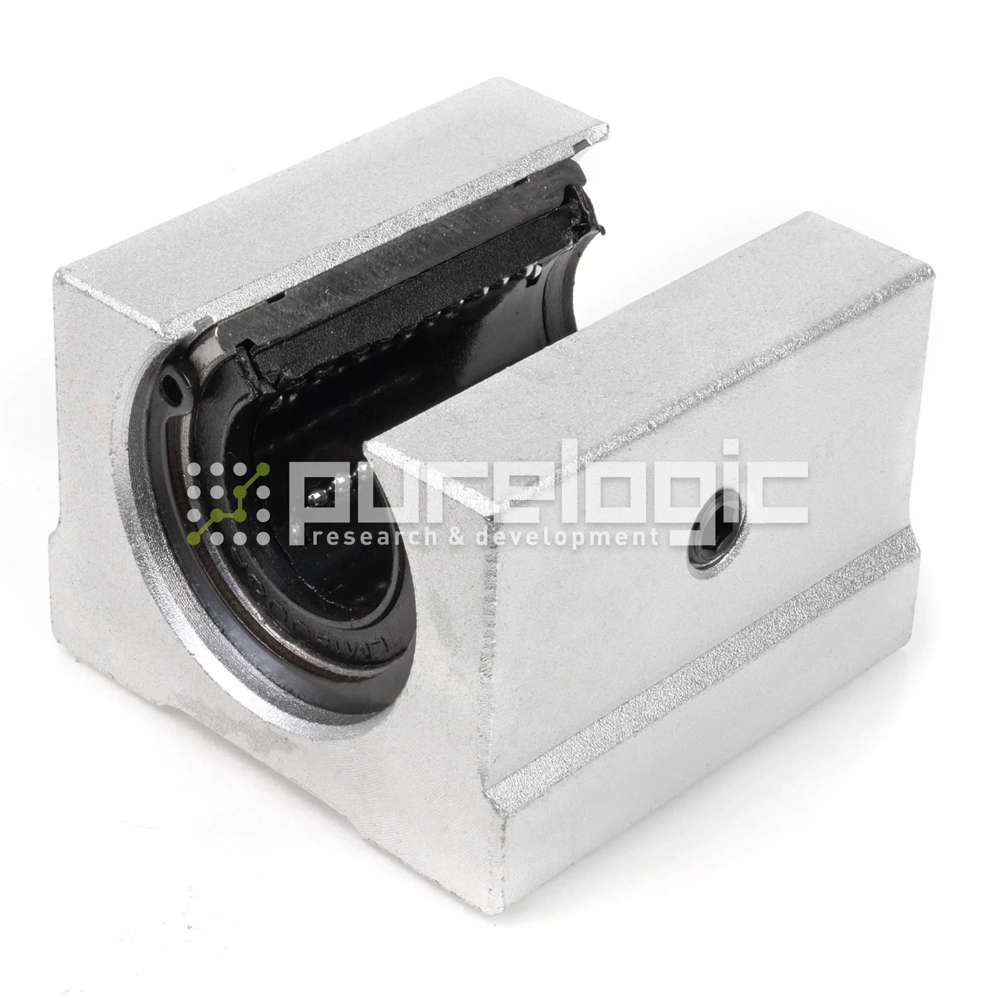 Опорный модуль SBR16 используется вместе с цилиндрическим рельсом соответствующего диаметра. Конструкция линейного подшипника качения представлена шариковой втулкой открытого типа, помещенной в алюминиевый корпус. Для удобного монтажа на кронштейн или пластину предусмотрены резьбовые отверстия. При установке подшипника необходимо отрегулировать установочные винты, что важно для беспрепятственного движения вдоль вала.