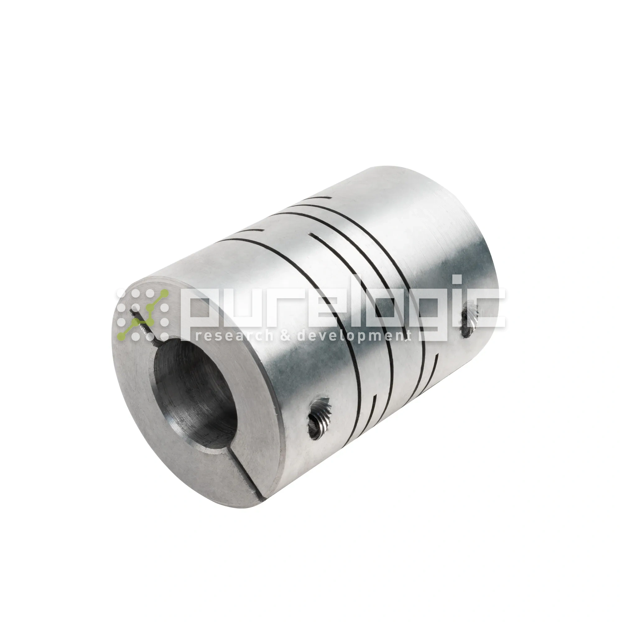 Сплошной цельный корпус из алюминиевого сплава, средняя часть корпуса имеет несколько небольших поперечных разрезов, позволяя муфтам изгибаться в определенных пределах. Фиксируется на валу затяжкой, с помощью винта. Муфта применяется в узлах, где требуется компенсация несоосности валов и угла между валами. Передает крутящий момент средней величины, обеспечивает безлюфтовую передачу и большую скорость вращения. Возможна поломка при предельной нагрузке. D=30мм, L=40мм, d1=14мм, d2=12мм, момент 10Н*м.