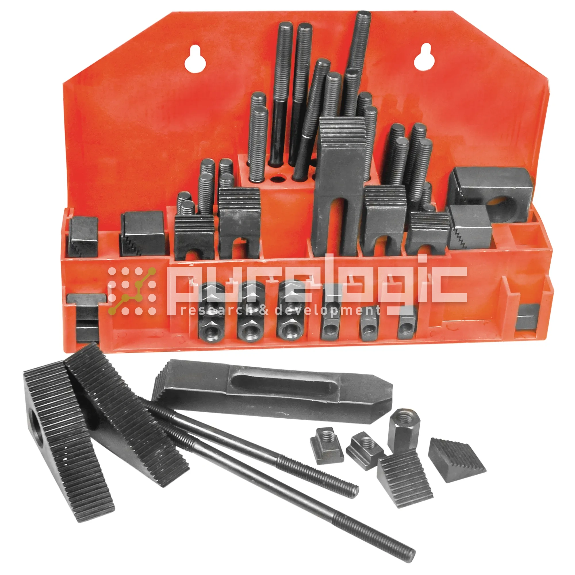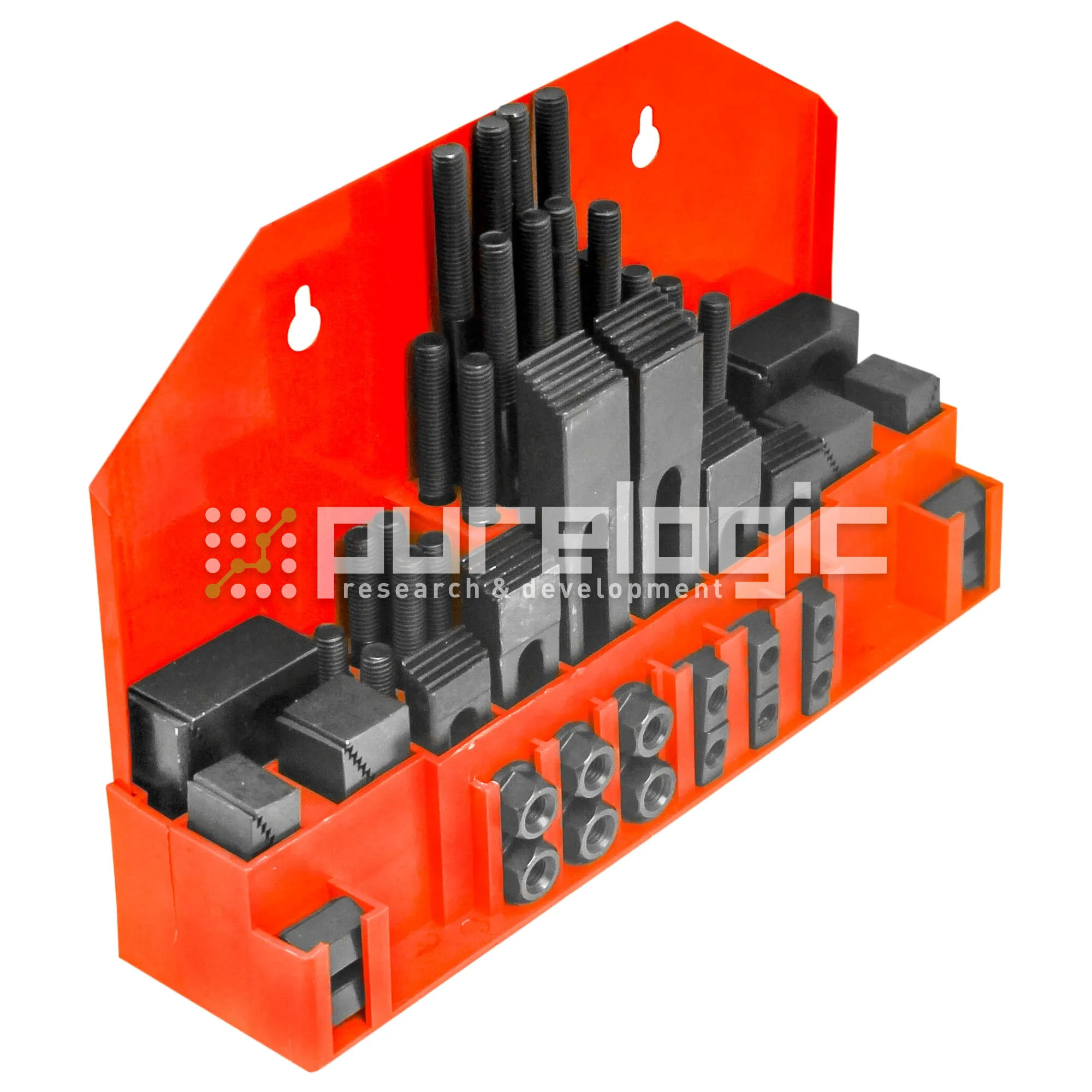 Набор приспособлений для фиксации заготовки на рабочем столе станка с креплением типа Т-слот. Набор состоит из всех необходимых для работы компонентов - винтов, Т-гаек, прижимов, фланцевых гаек и пр. + удобное приспособление для хранения. Т-слот 10мм, М8х1.25.