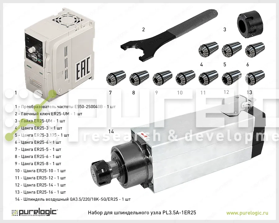 Состав набора: шпиндель QA3.5/220/18K-SQ/ER25 (квадрат), преобразователь частоты DL100-2S0040B, цанга ER25-3, цанга ER25-3.175, цанга ER25-4, цанга ER25-5, цанга ER25-6, цанга ER25-8, цанга ER25-10, цанга ER25-12, цанга ER25-14, цанга ER25-16, гайка ER25-UM, гаечный ключ ER25-UM.