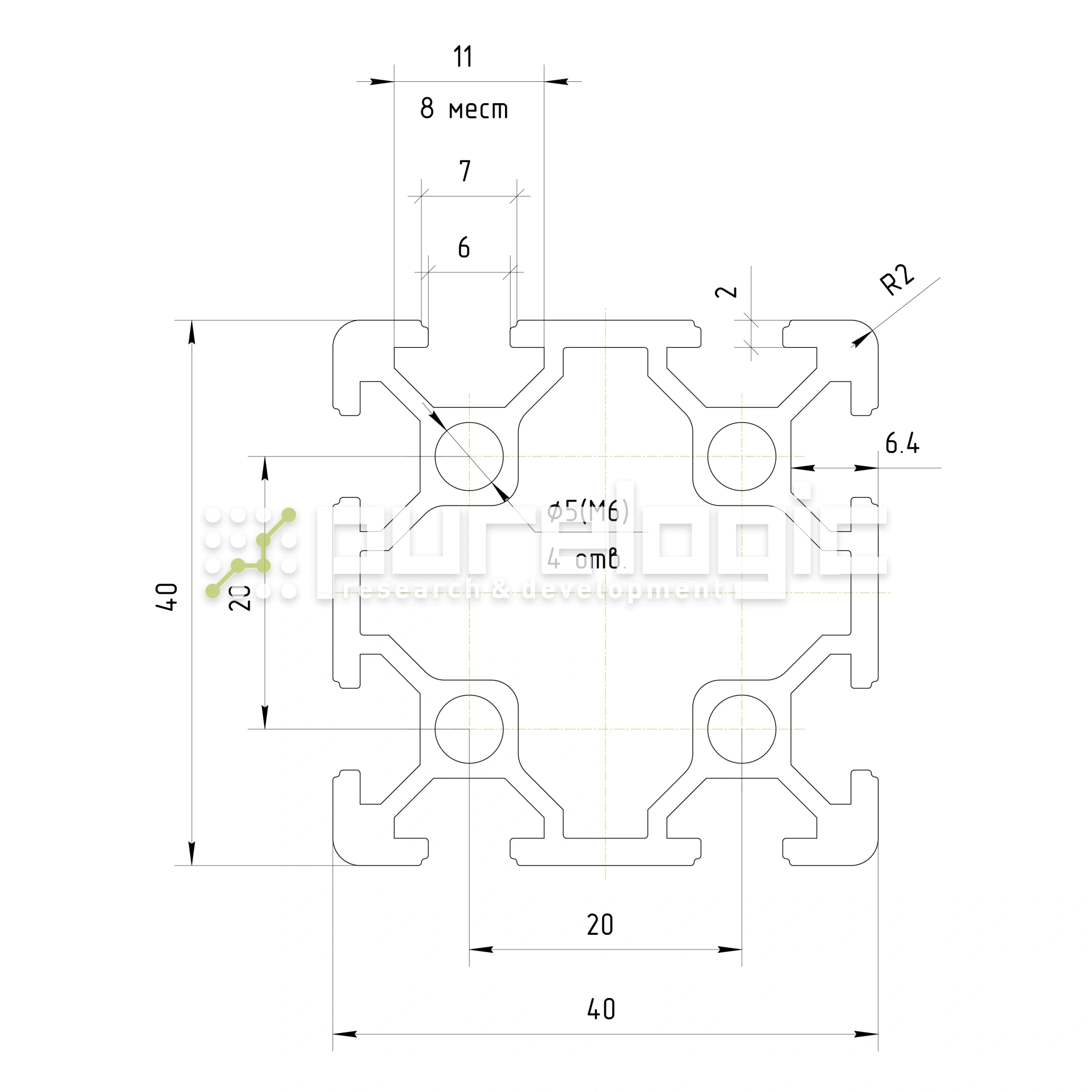 Анодированный конструкционный алюминиевый профиль с пазами под крепление гайкой. Профиль имеет высокую прямолинейность, удельную жесткость на изгиб и кручение. Профиль легко обрабатывается и собирается, благодаря наличию разнообразных аксессуаров. Цена указана за метр. 40х40мм, паз 6мм